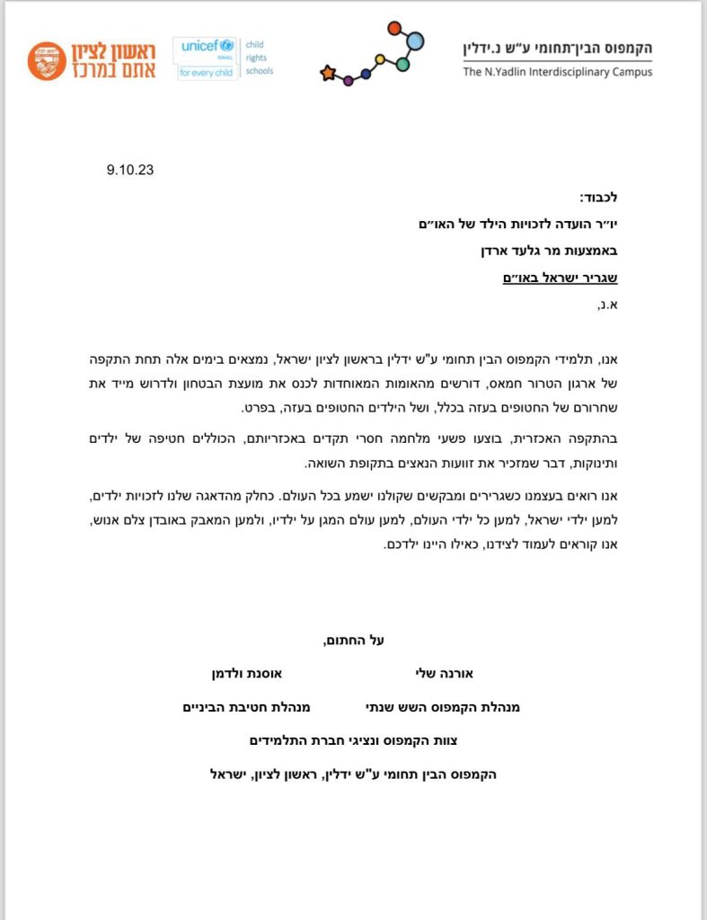 מכתב לועדה לזכויות הילד באו"ם